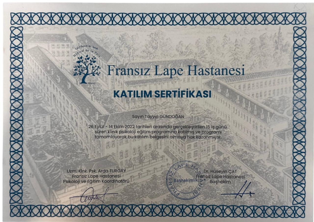 Uzm Kln. Psk Tayyip Gündoğan, lisans eğitimini Yeni Yüzyıl Üniversitesi Psikoloji Bölümü’nde onur derecesiyle tamamlamış, ardından Üsküdar Üniversitesi’nde Klinik Psikoloji yüksek lisans eğitimini onur derecesiyle bitirmiştir. Yüksek lisans tezinde, şizofrenide tedavi yöntemlerine yönelik güncel tedavi yöntemlerini ele almıştır.